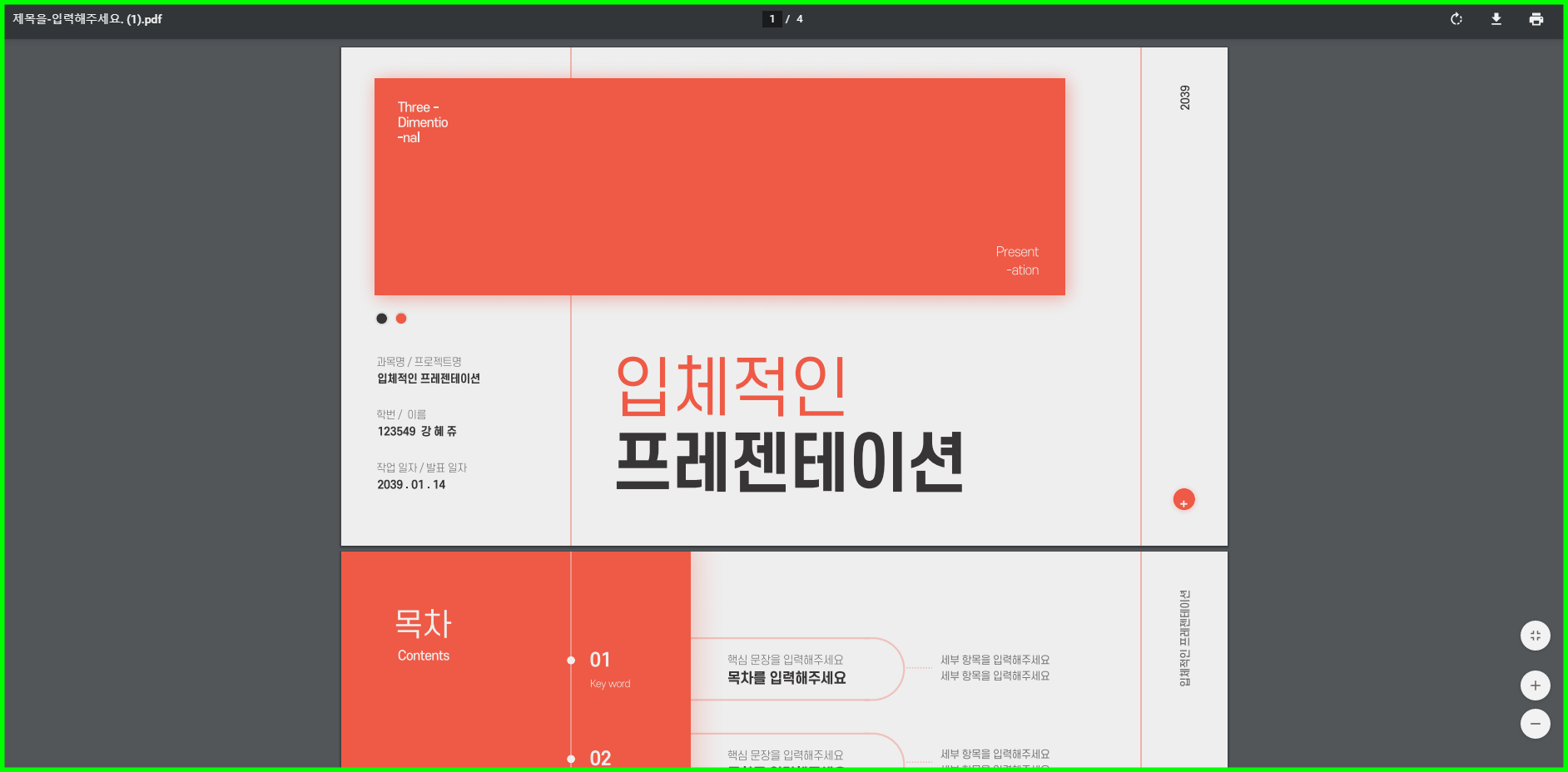 앞표지, 소개글, 목차, 내용 등등 사용자가 원하는 템플릿을 선택하면 바로 적용된 화면이 나온다.