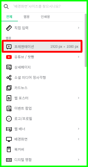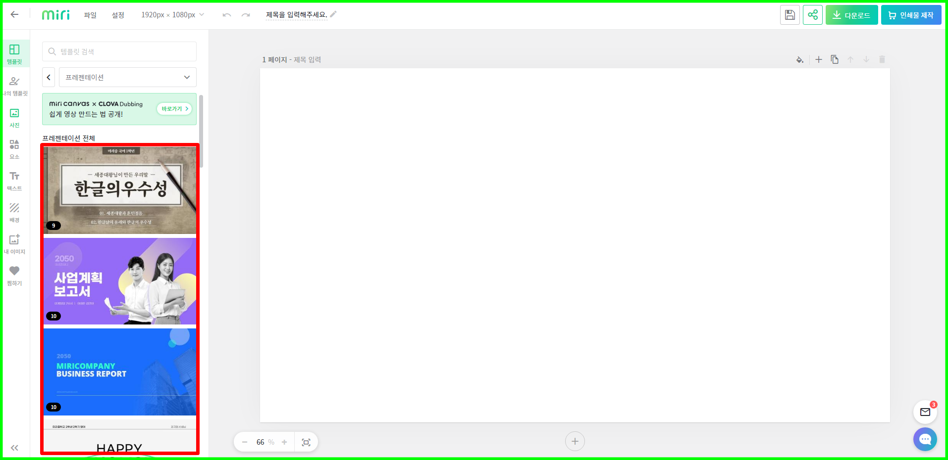 왼쪽엔 프리젠테에션에서 테이션에서 쓰이는 다양한 템플릿이 존재한다.