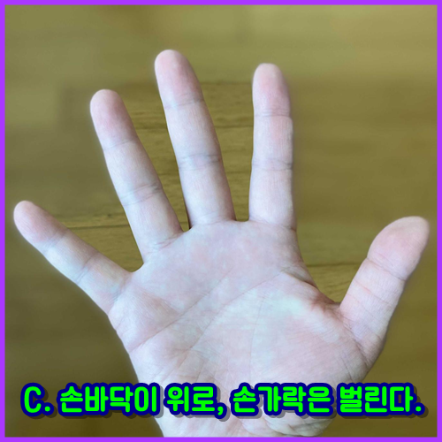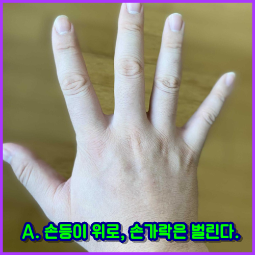 A. 손등이 위로, 손가락은 벌린다.