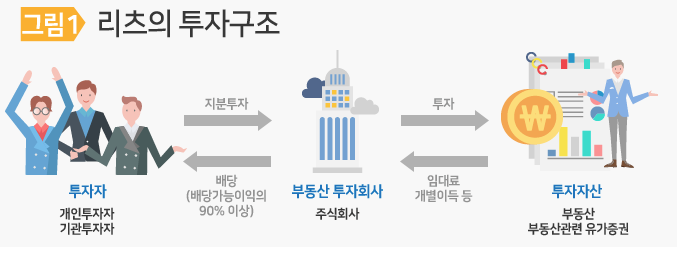 많은 투자자들의 자본으로 부동산을 취득하거나 금융을 제공하기 위해 결합한 회사나 영업 신탁을 말하며 대상 부동산은 부동산에 투자하여 소득을 올릴 수 있는 수익성 부동산을 의미한다. 투자자 입장에서는 전문적으로 관리되며 상업용 부동산 재산 또는 모기지에 투자하여 가치를 증진시키는 것이 목적인 REITs회사의 주식을 취득함으로써 부동산에 직접 투자해서 발생하는 제반 문제와 위험을 회피할 수 있다. REITs는 때로 부동산을 위한 뮤추얼펀드로도 설명된다.