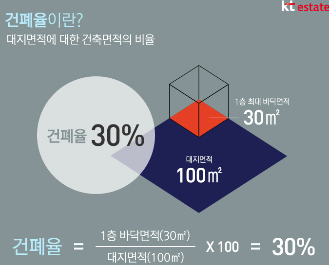 대지면적에 대한 건축면적의 비율을 말한다. 건물 1층의 바닥면적을 대지면적으로 나누고 퍼센트로 표시한다(용적률은 전체 면적이라면 건폐율은 1층 바닥면적만 따진다.) 지면상에 최소한의 공지를 확보하여 건축물의 밀집 방지, 일광, 채광, 통풍 등 위생을 양호하게 하고, 화재 또는 비상시 피난 등에 필요한 공간을 확보하기 위한 목적으로 만들어졌다. 건물의 1층 바닥면적은 건평이라고 한다.