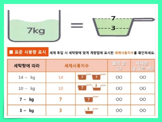 보통 세제를 많이 넣으면 때가 더 잘 빠질 것이라고 생각하는 것이 일반적인 생각일 것입니다. 하지만 이는 잘못된 생각인데요. 표준 사용량 이상의 세제를 사용하더라도 표준 사용량을 사용하는 거에 비해 세척력은 거의 증가하지 않습니다. 때문에 심하게 오염된 옷을 세탁할 때는 세제를 더 넣지 말고 오염된 부분만 따로 애벌빨래를 한 다음 세탁기에 처리하는 것이 바람직합니다.
