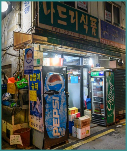 힙지로 바이브. 요즘 핫한 힙지로의 느낌 그자체. 마치 유통업체 이름 일것만 같은 이 식당은 이름만큼이나 독특한 식당으로 유명합니다. 이른바 이모카세(이모+오마카세)라 불리는 방식으로 운영 중인데요. 매일 신선한 재료를 바탕으로 나오는 요리가 다릅니다. 물론 기존 메뉴들도 주문 할 수 있지만 미리 예약을 해야 합니다. 문어숙회, 갈비찜, 전복찜, 새우튀김, 생선회, 아귀 수육 등 10가지가 넘는 안주 메뉴들이 있으며 특히 소 갈비찜이 대표 메뉴입니다. 참고로 소 갈비찜은 메뉴판에 없고 미리 예약 해야 합니다. 처음엔 가격(인당 4만원)이 다소 높다고 느껴질 수 있지만 막상 주방에서 코스대로 음식이 나오는 것 보면 가격은 머리 속에서 잊혀지고 금세 술과 안주에 빠져들게 합니다.