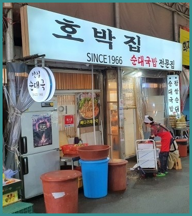 첫번째는, 1966년부터 영등포 시장 순대골목을 지켜온 호박집 입니다. 영등포시장 입구에 위치하고 있으며 대표 메뉴는 모듬 고기로 찹쌀 순대, 머리 고기, 내장을 넉넉하게 담아 나옵니다. 찰진 식감의 순대와 잡내 없는 고소한 내장의 조화가 매력적 입니다. 이 집의 또 다른 인기 메뉴는 간장,식초,고춧가루,청양고추를 기가막히게 배합한 양념장에 찍어 먹는 수육입니다. 그냥 식사를 하러 온 사람들도 이 집의 분위기와 반찬으로 나온 편육을 먹고 나면 지체없이 소주를 한잔 시키게 됩니다.