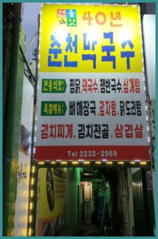 약수역 근처에 위치한 춘천막국수는 생활의 달인, 식객 허영만의 백반기행, 연애의 맛 등 다양한 매체에 소개된 약수동 최고 맛집 중 하나로 뽑히는 곳입니다. 다른 곳에선 맛볼 수 없는 이북식 찜닭이 대표 메뉴인데 메밀 반죽을 묻힌 생닭을 호박잎을 덮어 24시간 숙성 시켜 고소한 풍미와 쫀득한 육질을 살린 맛이 예술입니다. 소주 한잔과 함께 닭고기를 부추에 돌돌말아 양념장을 찍어 먹으면 그날의 스트레스를 날리기에 충분한 맛입니다. 단체 예약이 가능하기 때문에 회식을 하기에도 적합한 식당입니다.