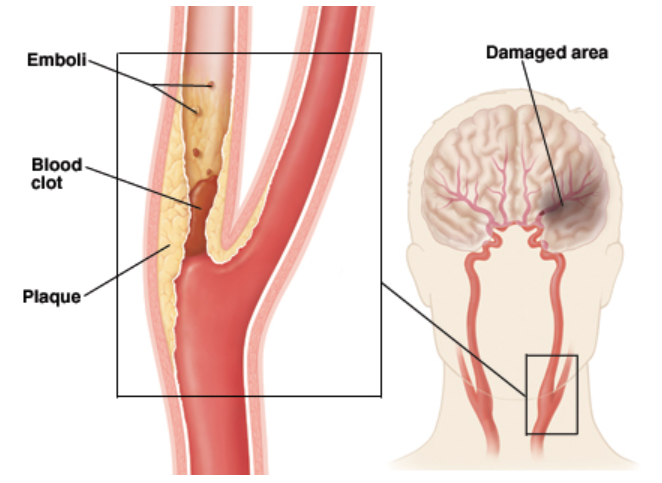 혈관이 서서히 좁아지며 아무런 증상없이 막히는 사람도 간혹 있지만, 대부분의 경우에는 뇌로 가는 혈류가 부족해지거나 좁아진 동맥경화성 혈관에서 발생한 혈전이나 작은 조각이 갑작스럽게 경동맥이나 뇌혈관을 막게 되어 마비, 의식소실, 언어장애, 시력저하와 같은 뇌경색이나 일시적 증을 유발하게 됩니다.