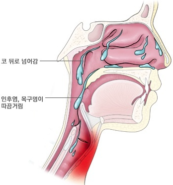 후비루증후군은 흔히 ‘콧물이 뒤로 넘어가는 증상’을 말하며 평소에 콧물이 많은 환자가 콧물이 목 뒤로 넘어가며 목 뒤의 ‘기침 수용체’를 자극하면 기침이 발생합니다. 후비루 증후군의 원인은 매우 다양하며 알레르기성 비염, 감염(감기) 후 비염, 부비동염(축농증) 등이 있습니다. 기침할 때 입안을 자세히 보면 콧물이 뒤로 넘어가는 모습이 보이기도 합니다. 후비루증후군의 경우는 병원에서는 콧물을 줄이는 항히스타민제 등의 약물치료를 시도하여 치료 할 수 있습니다.